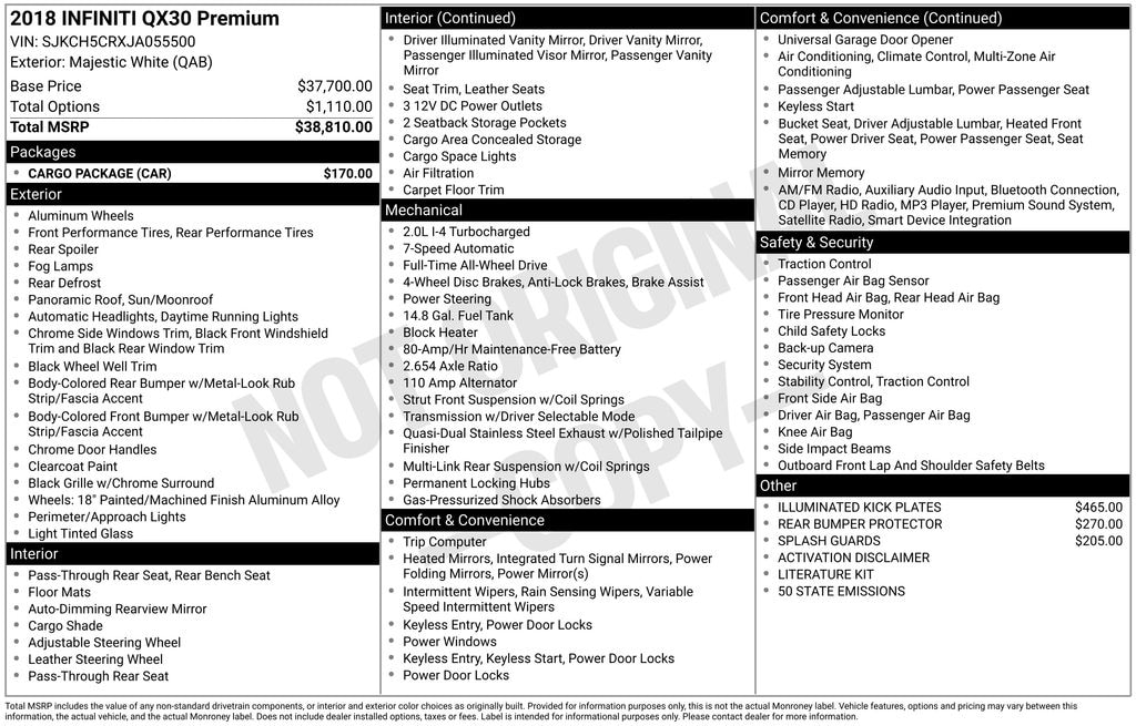 It offers the latest in technological innovation and style. Turbocharger technology provides forced air induction, enhancing performance while preserving fuel economy. INFINITI prioritized practicality, efficiency, and style by including: power front seats, a roof rack, and much more. Smooth gearshifts are achieved thanks to the efficient 4 cylinder engine, and for added security, dynamic Stability Control supplements the drivetrain.